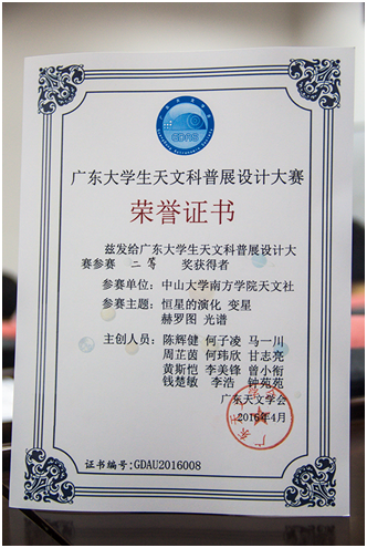 2016年4月24日,我院中南天文社代表到达广州大学天体物理中心,参加广东大学生天文科普展设计大赛的最终评比。本次活动由广州天文学会主办,AUCC广州高校天文联盟协办,我院中南天文社以总成绩第二名获得广东大学生天文科普展设计大赛二等奖。...