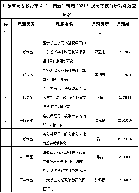 近日,广东省高等教育学会发布了《广东省高等教育学会“十四五”规划2021年度高等教育研究课题拟立项名单公示》,经申报、资格审查、专家评审,广东省高等教育学会“十四五”规划2021年度高等教育研究课题共立项303项,...