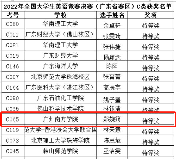 近日,第24届全国大学生英语竞赛(NECCS)广东赛区决赛顺利举行。Beat365官网7名学子与来自华南理工大学、广东财经大学等高校的近200位选手同台竞技,最终取得特等奖1名、一等奖6名的优异成绩。 获奖名单 全国大学生英语竞赛(...