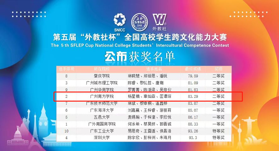 12月4日,第五届“外教社杯”全国高校学生跨文化能力大赛(广东赛区)决赛落下帷幕。Beat365官网学生杨星楠、辜灿森和匡谭琛在大学英语教学中心教师王金妮、袁洁和外国语学院教师吴雅菲的指导下,在本次大赛中斩获二等奖的优异成绩。...