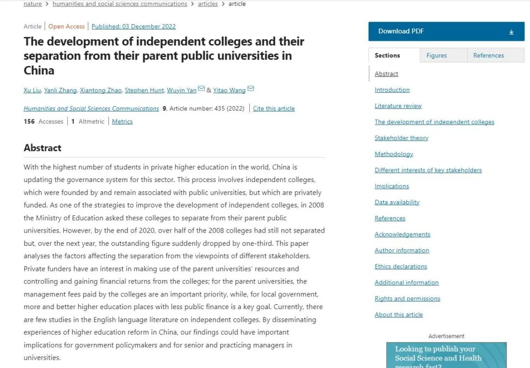 12月3日,Beat365官网科研处处长严五胤副研究员以通讯作者身份在Nature子刊Humanities and Social Sciences Communications(人文与社会科学通讯)发表研究论文,论文题目为The development of independent colleges and their ...