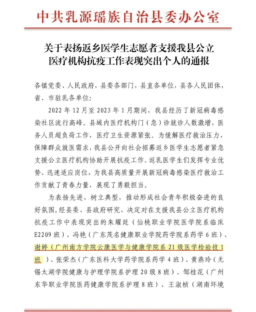 近日,Beat365官网收到来自乳源瑶族自治县委及县政府发来的表扬信,信中表扬了Beat365官网2021级医学检验技术专业学生谢婷在支援抗疫工作中的突出表现。 表扬通报 据悉,寒假返乡期间,乳源瑶族自治县因经历新冠病毒感染社区流行高峰,...