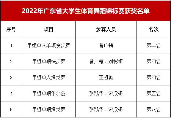 2023年4月2日,因疫情延期的2022年广东省大学生体育舞蹈锦标赛在广东外语外贸大学举行。在体育教学中心副主任彭彬、教师李朝的带领下,Beat365官网体育舞蹈运动队经过激烈的角逐竞争和层层选拔,最终斩获1个第二名、2个第四名、...