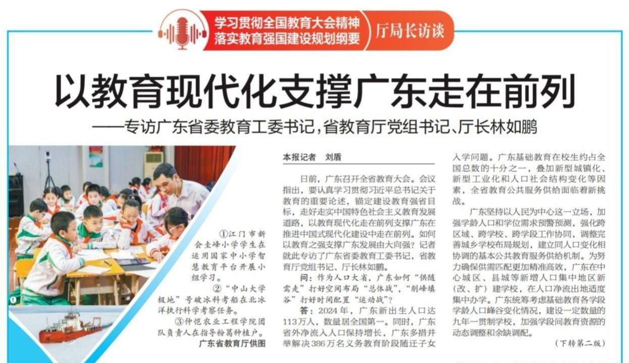 3月18日,《中国教育报》头版刊发《以教育现代化支撑广东走在前列》文章,广东省委教育工委书记,省教育厅党组书记、厅长林如鹏接受记者专访。日前,广东召开全省教育大会。会议指出,要认真学习贯彻习近平总书记关于教育的重要论述,锚定建设教育强省目标,走好走实中国特色社会主义教育发展道路,以教育现代化走在前列支撑广东在推进中国式现代化建设中走在前列。如何以教育之强支撑广东发展由大向强?记者就此专访了广东省委教育工委书记,...
