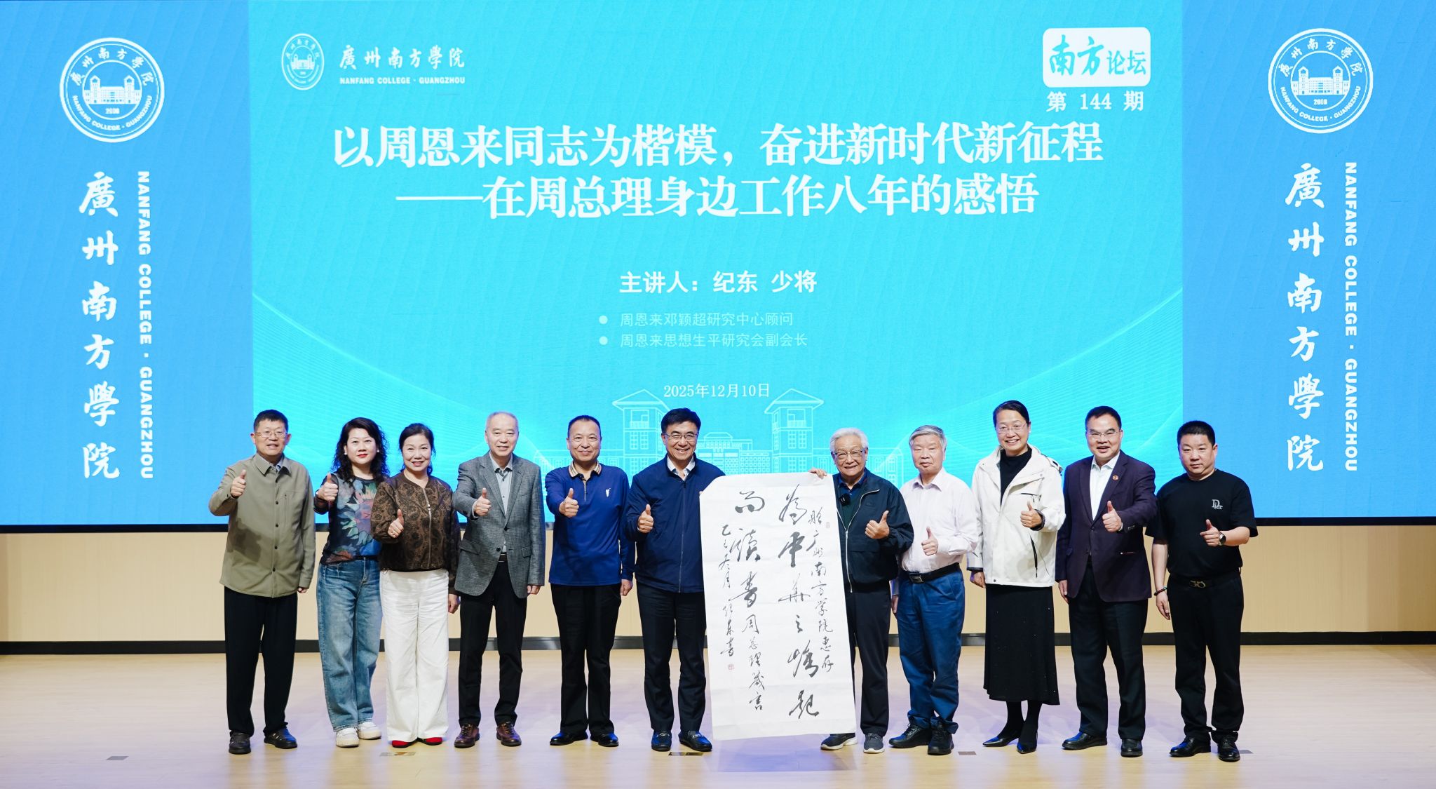 12月10日下午,南方论坛第144期在学校格致楼报告厅举行。周恩来邓颖超研究中心顾问、周恩来思想生平研究会副会长纪东将军担任主讲嘉宾,作题为《以周恩来同志为楷模,奋进新时代新征程》的讲座。中国中共文献研究会周恩来思想生平研究分会常务理事殷华研究员等一行人出席讲座。校长汤涛院士、党委书记李建超研究员等校领导,各教学单位、行政单位主要负责人以及师生代表共计400余人参加讲座,讲座由校长顾问、博雅学院院长张明远教授主持。...