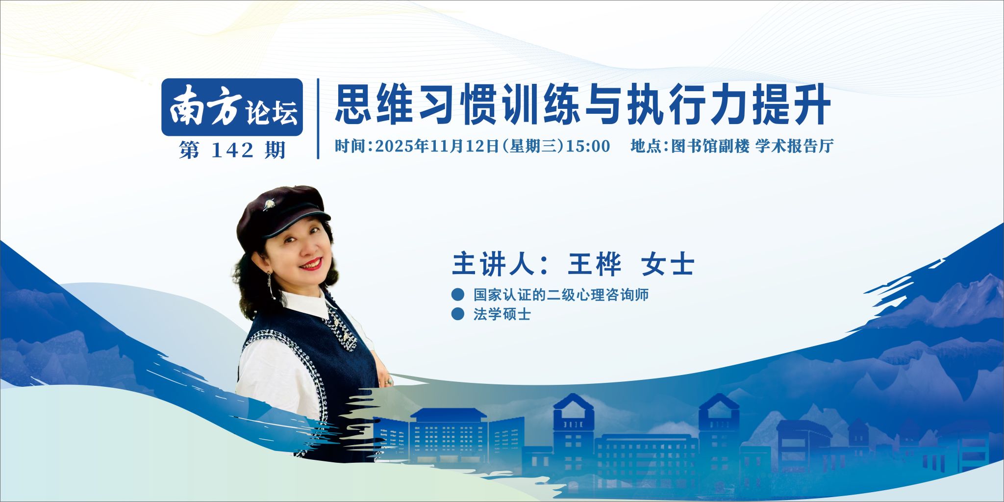 讲座主题“思维习惯训练与执行力提升”专题报告暨南方论坛第142讲讲座信息时 间:2025年11月12日(星期三)15:00地 点:图书馆副楼 学术报告厅主讲人:王桦 女士 国家认证的二级心理咨询师 法学硕士 主讲人简介 王桦,女,国家认证的二级心理咨询师。法学硕士。先后任国家海关总署办公厅副主任、新闻办公室主任、海关出版社社长(正局级)、海关信息中心党委书记(正局级)等职,具有丰富的机关、企事业单位管理经验。...