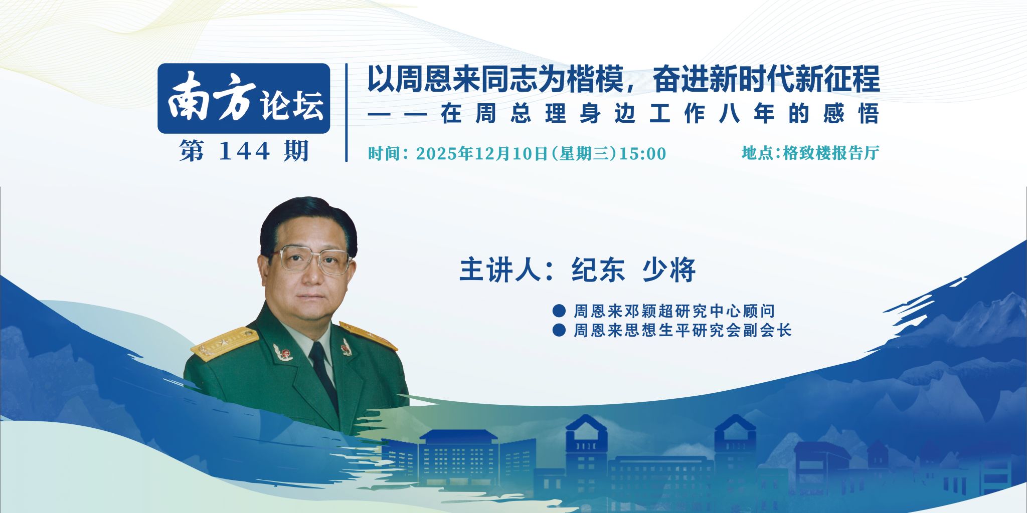 讲座主题“以周恩来同志为楷模,奋进新时代新征程--在周总理身边工作八年的感悟”专题报告暨南方论坛第144讲讲座信息时 间:2025年12月10日(星期三)15:00地 点:格致楼报告厅主讲人:纪东 少将 周恩来邓颖超研究中心顾问 周恩来思想生平研究会副会长主讲人简介纪东,1943年11月出生,河南省商丘市夏邑县人。1961年8月从西安市参军。1961年8月至1968年8月,在中央警卫团工作:1968年8月,奉调担任周恩来总理秘书至1976年1月周总理逝世。...