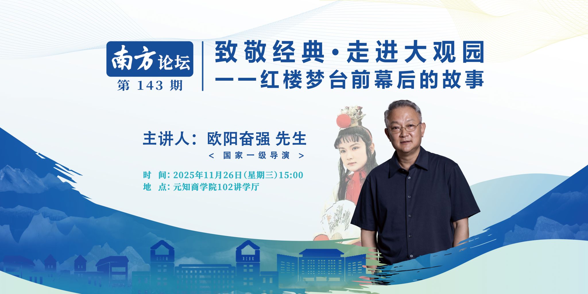 讲座主题“致敬经典、走进大观园一一红楼梦台前幕后的故事”专题报告暨南方论坛第143讲讲座信息时 间:2025年11月26日(星期三)15:00地 点:元知商学院102讲学厅主讲人:欧阳奋强 先生 国家一级导演 主讲人简介 欧阳奋强,四川成都人。1964年3月5日出生于四川省成都市,中国男演员、导演。1983年因在电视剧《红楼梦》中饰演贾宝玉而广为人知。1987年转型导演,长期在四川电视台从事影视创作,执导多部电视剧及电影,...