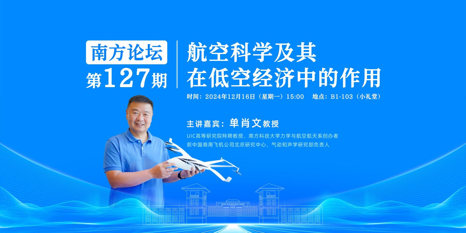 讲座主题“航空科学及其在低空经济中的作用”专题报告暨南方论坛第127讲讲座信息时间:2024年12月16日(星期一)15:00地点:B1-103(小礼堂)主讲人简介单肖文,教授,博士生导师,UIC高等研究院的特聘教授,分别于1985年、1988年获得北京大学学士和硕士学位,1991年获得达特茅斯学院博士学位。1991年至2012年,单教授先后任职于美国的洛斯阿拉莫斯国家实验室、微软和Exa 公司(现为达索系统SE的一部分);2012年加入中国商用飞机公司(...