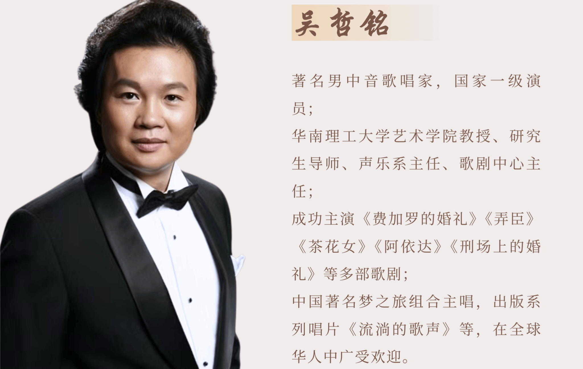 讲座主题知音讲堂 第一讲: 如何让歌唱更加动听——吴哲铭教授声乐公开课讲座信息时间:2024年11月13日(星期三)15:00地点:Beat365中文官方网站音乐楼音乐厅主讲人简介吴哲铭,著名男中音歌唱家,国家一级演员,曾任广东歌舞剧院副院长。现任华南理工大学艺术学院教授、研究生导师、声乐系主任、歌剧中心主任,中国音乐家协会会员,中国环境文化促进会理事,广东省音乐家协会理事,广东省声乐研究会副会长,广州鳟鱼歌剧团团长。曾获广东省第六届羊城音乐花会声乐大赛专业组美声唱法第一名、...