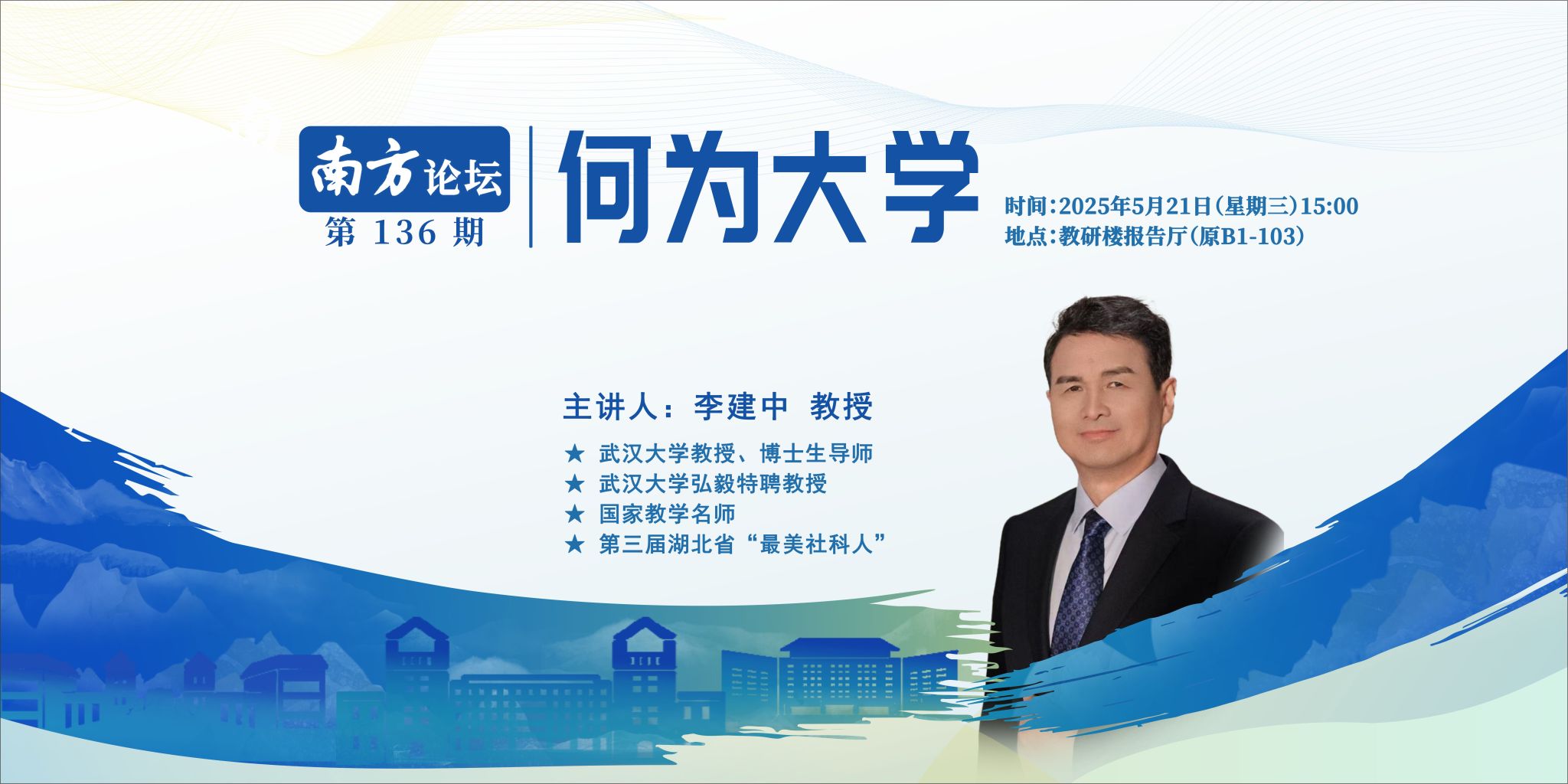 讲座主题“何为大学”专题报告暨南方论坛第136讲讲座信息时 间 :2025年5月21日(星期三)15:00地 点 :教研楼报告厅(原B1-103)主讲人:李建中,武汉大学教授、博士生导师、武汉大学弘毅特聘教授、国家教学名师、第三届湖北省“最美社科人”。主讲人简介李建中,武汉大学文学院二级教授,博士生导师,文艺学学科带头人。武汉大学弘毅特聘教授,武汉大学通识教育中心主任。国家教学名师,第三届湖北省“最美社科人”。兼任中国古代文学理论学会副会长,...