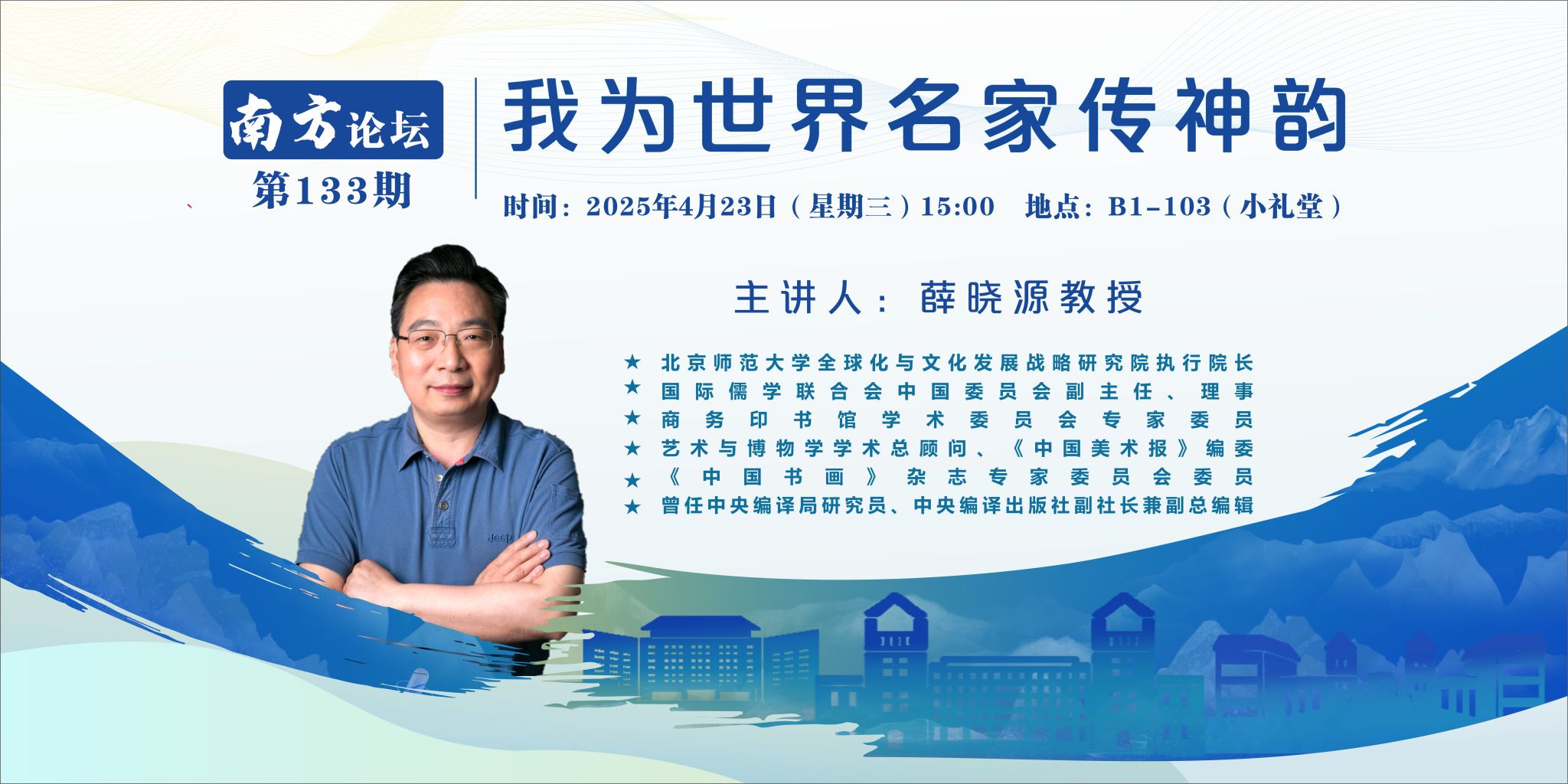 讲座主题南方论坛第133期:我为世界名家传神韵讲座信息讲座时间:2025年4月23日(星期三)15:00讲座地点:B1-103(小礼堂)主讲人:薛晓源,博士、教授,现任北京师范大学全球化与文化发展战略研究院执行院长;国际儒学联合会中国委员会副主任、理事;商务印书馆学术委员会专家委员、艺术与博物学学术总顾问主持人:校长顾问、博雅学院院长张明远教授 主讲人简介薛晓源,博士,北京师范大学人文和社会科学高等研究院拔尖人才,北京师范大学全球化与文化发展战略研究院院长、...