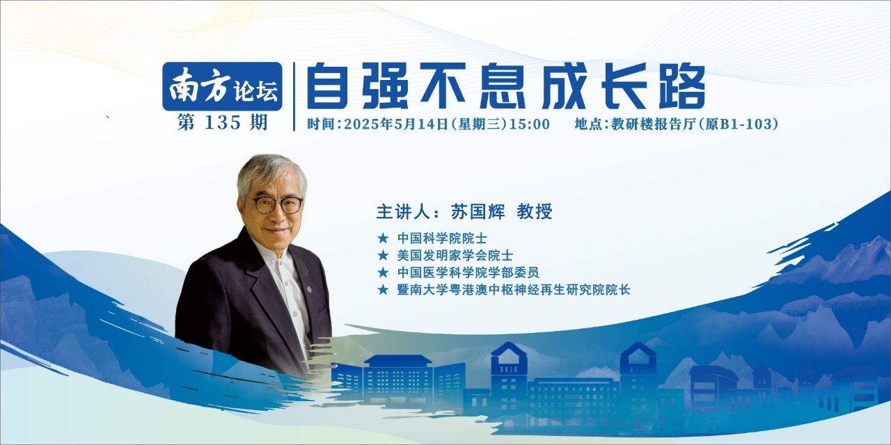 讲座主题“自强不息成长路”专题报告暨南方论坛第135讲讲座信息时 间 :2025年5月14日(星期三)15:00地 点 :教研楼报告厅(原B1-103)主讲人:苏国辉教授,中国科学院院士、美国发明家学会院士、中国医学科学院学部委员、暨南大学粤港澳中枢神经再生研究院院长。 主讲人简介 苏国辉,暨南大学粤港澳中枢神经再生研究院院长;香港大学荣休教授,脑与认知科学国家重点实验室主任,社会科学学院及眼科学系解剖学讲座教授;中科院院士;...