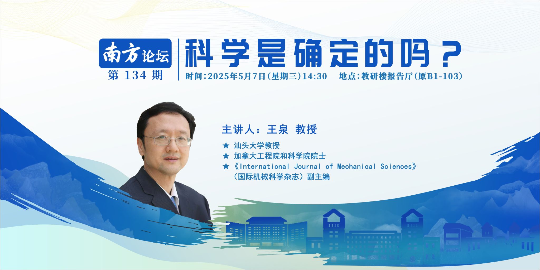 讲座主题“科学是确定的吗?”专题报告暨南方论坛第134讲讲座信息时 间 :2025年5月7日(星期三)14:30地 点 :教研楼报告厅(原B1-103主讲人:王泉,汕头大学教授,加拿大工程院和科学院院士,《International Journal of Mechanical Sciences》(国际机械科学杂志)副主编 主讲人简介 王泉,汕头大学教授,加拿大工程院和科学院院士, Deputy Editor-in-Chief of the International Journal of Mechanical Sciences。王教授长期从事工程结构与材料领域前沿科学和工程技术研究,...