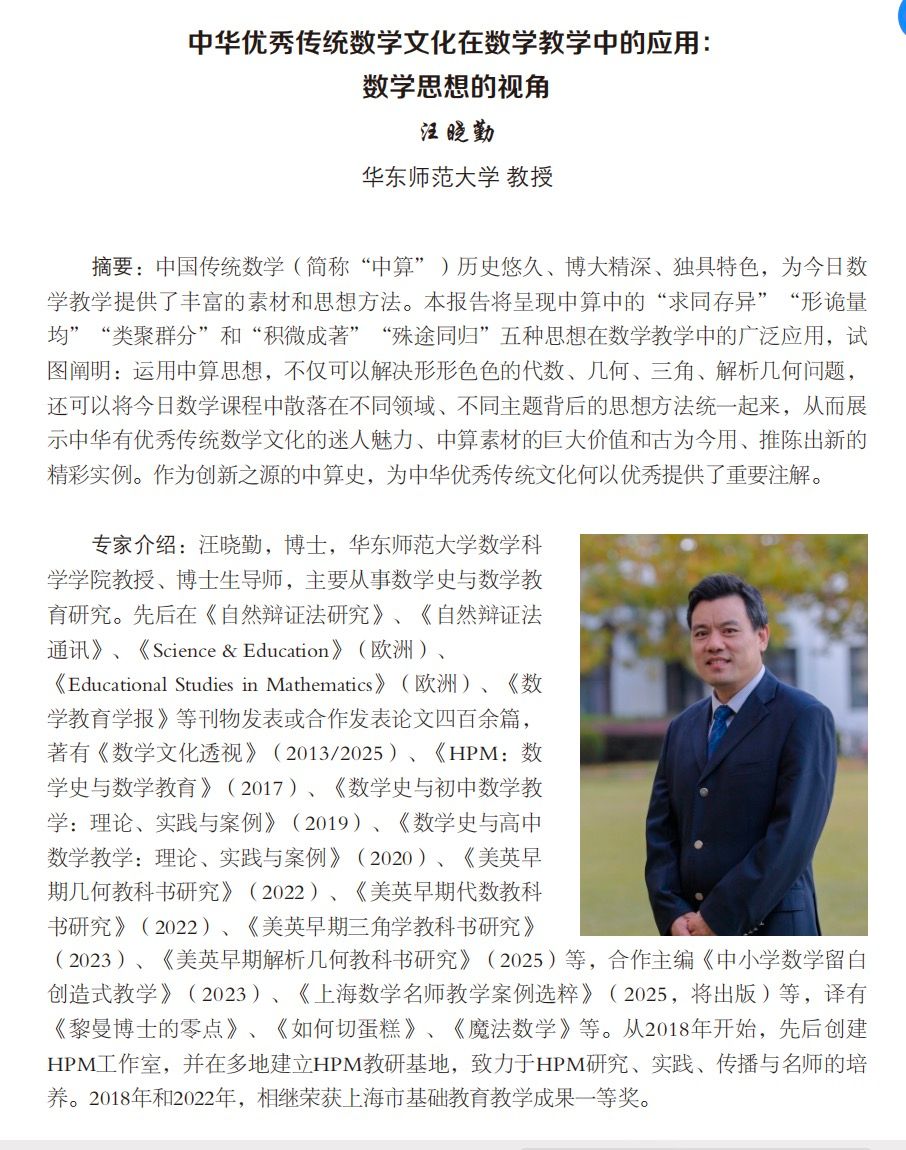主 题:中华优秀传统数学文化在数学教学中的应用:数学思想的视角