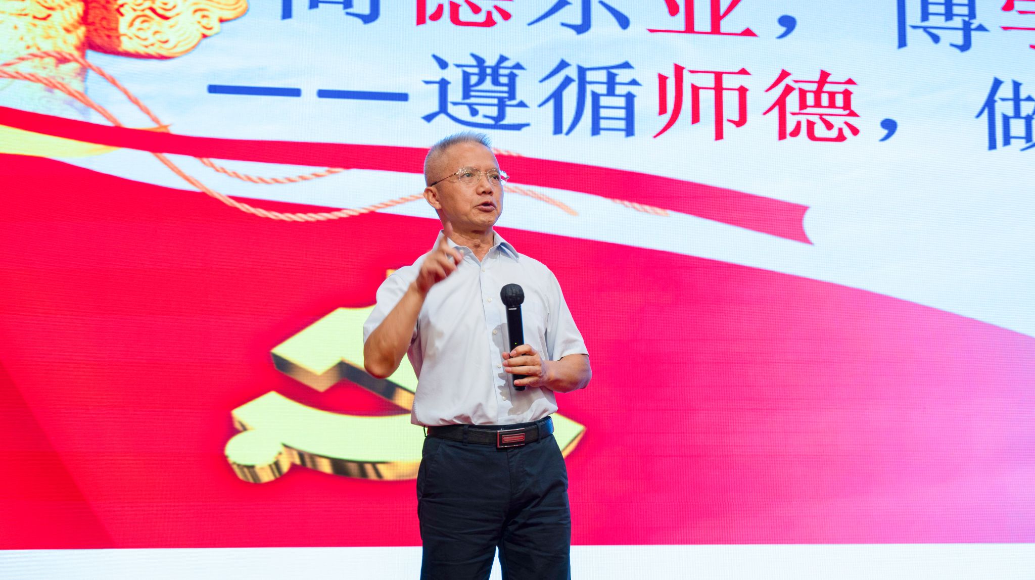 最后,马克思主义学院副院长邓泽球教授作题为《尚德乐业,博学善教——遵循师德,做好老师》的师德教育主题报告并带领全体新入职教师宣誓。