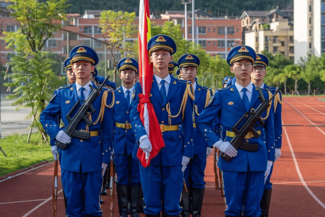 国教队国旗班迈着铿锵整齐的步伐,庄严地护卫着鲜艳的五星红旗走向升旗台。全体肃穆,奏唱国歌。五星红旗冉冉升起。