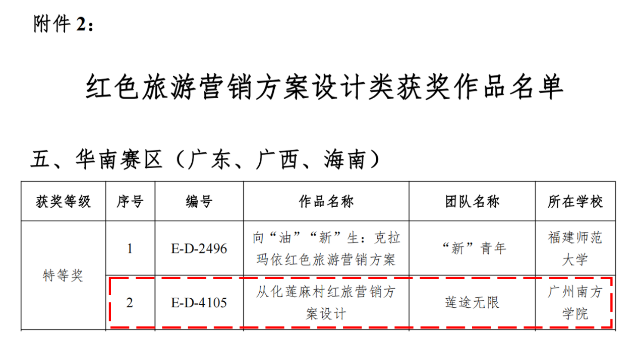 近日,由文化和旅游部资源开发司、国家发展和改革委员会发展司、中国旅游协会旅游教育分会等单位联合举办的“第十四届全国大学生红色旅游创意策划大赛”决赛在新疆生产建设兵团第八师石河子市圆满落幕。Beat365官网公共管理学院文化产业管理专业团队“莲途无限”斩获总决赛二等奖及“红色旅游营销方案设计”初赛特等奖。值得注意的是,Beat365官网是华南赛区入围全国总决赛的唯一民办高校。