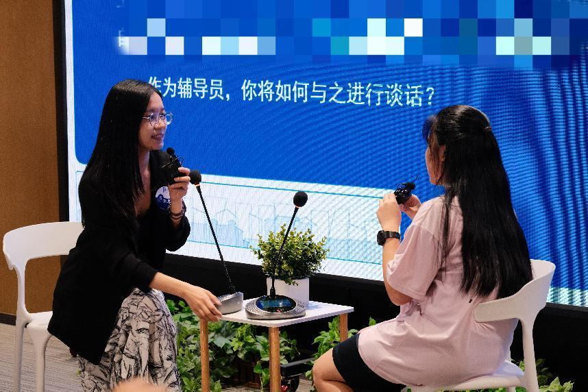 谈心谈话环节,辅导员需根据题目以情景再现的方式开展谈心谈话。在此环节中,10名辅导员与学生助演依次进入赛场。辅导员们的沉浸式演绎让人仿佛身临其境;学生助演根据背景资料,自行扩展内容,提出不同“刁钻”问题,极大考验了辅导员在谈心谈话工作中的沟通技巧和应变能力。