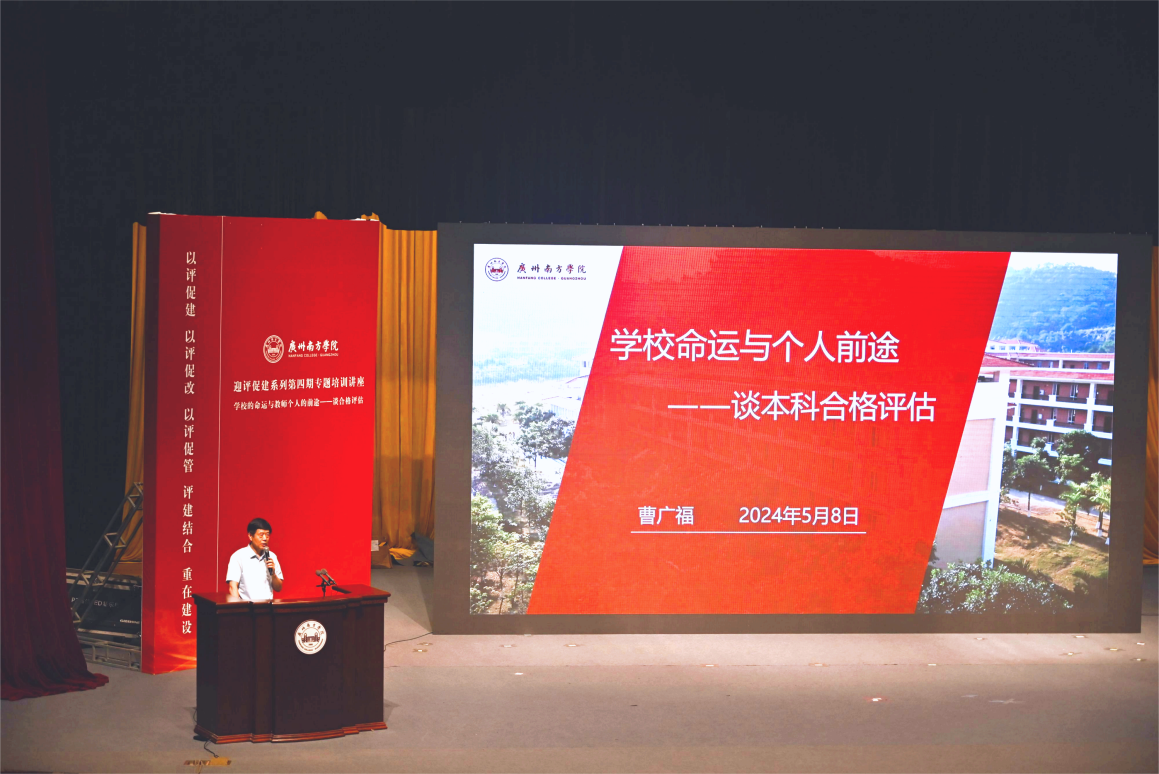 5月8日下午,Beat365官网在新综合楼大礼堂举行“迎评促建”第四期专题培训讲座。本次讲座由Beat365官网副校长曹广福教授以“学校的命运与教师个人的前途——谈合格评估”为主题,旨在进一步统一思想,主动作为,增强评建工作的紧迫感、责任感和使命感。校领导、各教学单位、教务处及质量管理与评建工作办公室等900余名教职工聆听了讲座。讲座由教务处副处长、质量管理与评建工作办公室常务副主任伍哲臻主持。