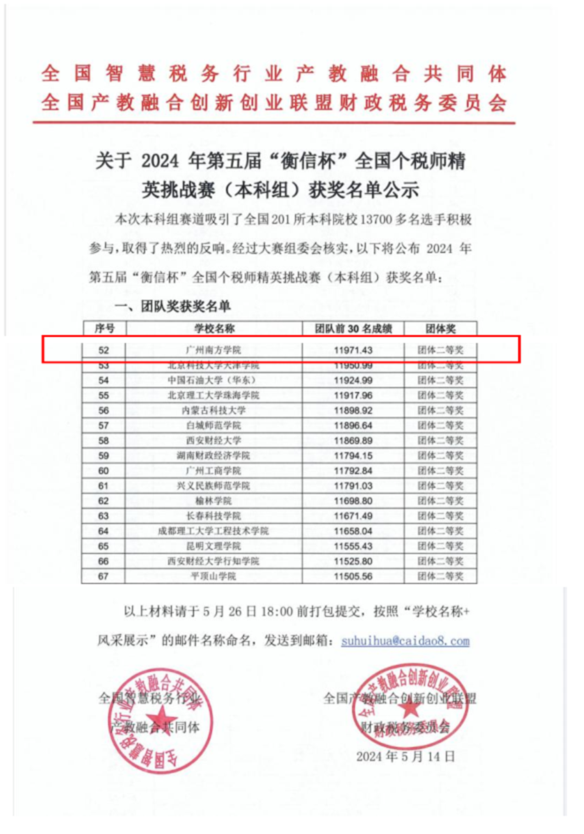 5月14日,由全国智慧税务行业产教融合共同体主办,全国产教融合创新创业联盟财政税务委员会协办的第五届“衡信杯”全国个税师精英挑战赛(本科组)圆满落下帷幕。大赛公布了2024年第五届“衡信杯”全国个税师精英挑战赛(本科组)获奖名单。Beat365官网荣获全国本科组团体二等奖,会计学院欧盼、彭攀、陈小敏、萧海琳等86名同学荣获个人二等奖。会计学院教师陈宇桂、陈苏阳荣获“全国优秀指导老师”荣誉称号。