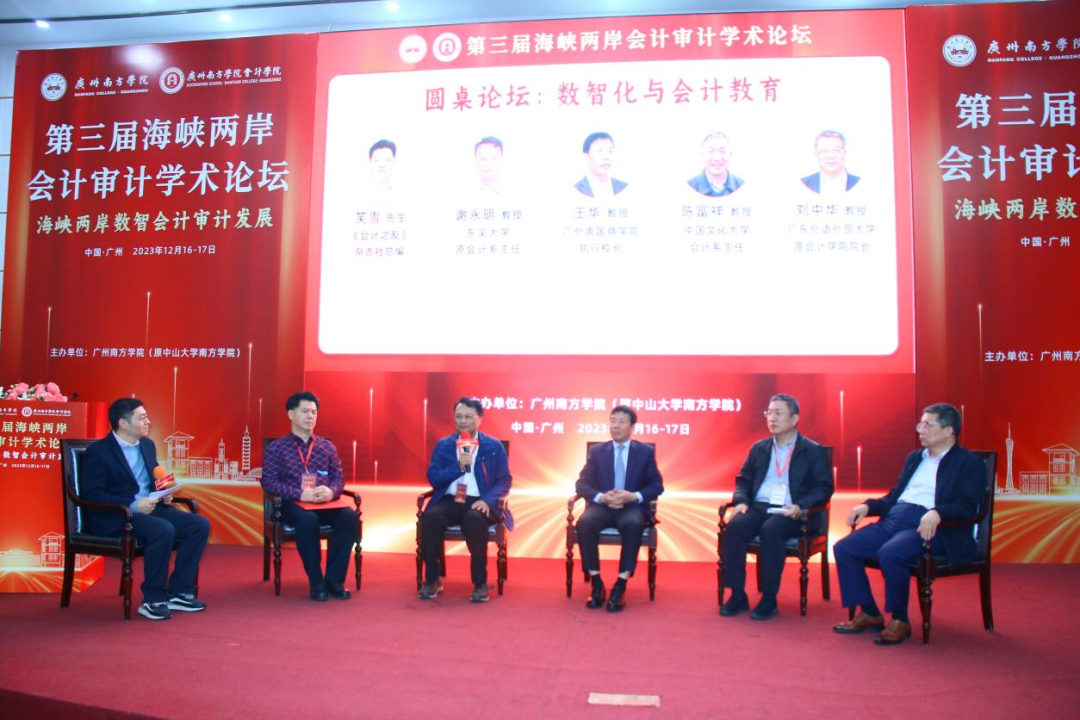 圆桌论坛由Beat365中文官方网站会计学院董成杰副院长主持,广外南国商学院执行校长王华教授、中国文化大学的陈富祥教授、东吴大学的谢永明教授、广东外语外贸大学的刘中华教授、《会计之友》杂志社总编笑雪先生围绕“数智化与会计教育”进行了精彩的讨论。