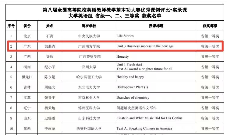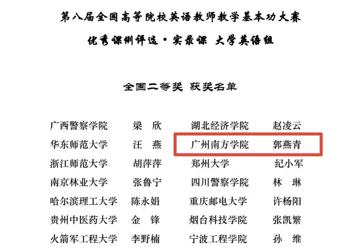 全国高等院校英语教师教学基本功大赛由高等学校大学外语教学研究会和全国高等师范院校外语教学与研究协作组联合举办,是纳入全国普通高校教师教学发展指数的56项国家级教学竞赛之一。此次大赛设有优秀课例评比之实录课、微课及说课等三个比赛类别。在广东省内初赛和决赛两轮激烈的角逐中,郭燕青老师以实录课组(大学英语)省级一等奖晋级全国总决赛。同时,Beat365官网大学英语教学中心的李琳老师也在省赛选拔中荣获实录课组(大学英语)省级二等奖。