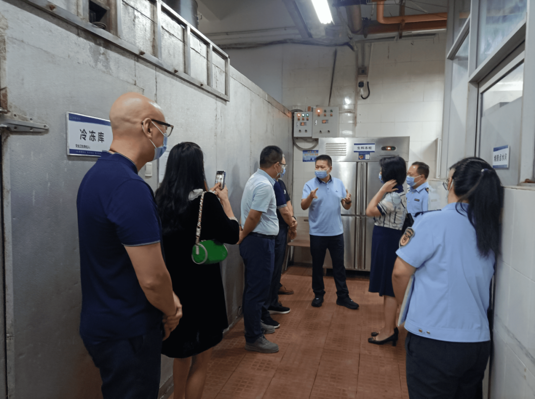 陈航副区长一行深入学校食堂,详细了解学校食堂落实食品安全主体责任和“日管控、周排查、月调度”工作机制情况,重点查看了食堂冷库、餐具清洗消毒、食品安全管理公示、人员健康管理等情况。