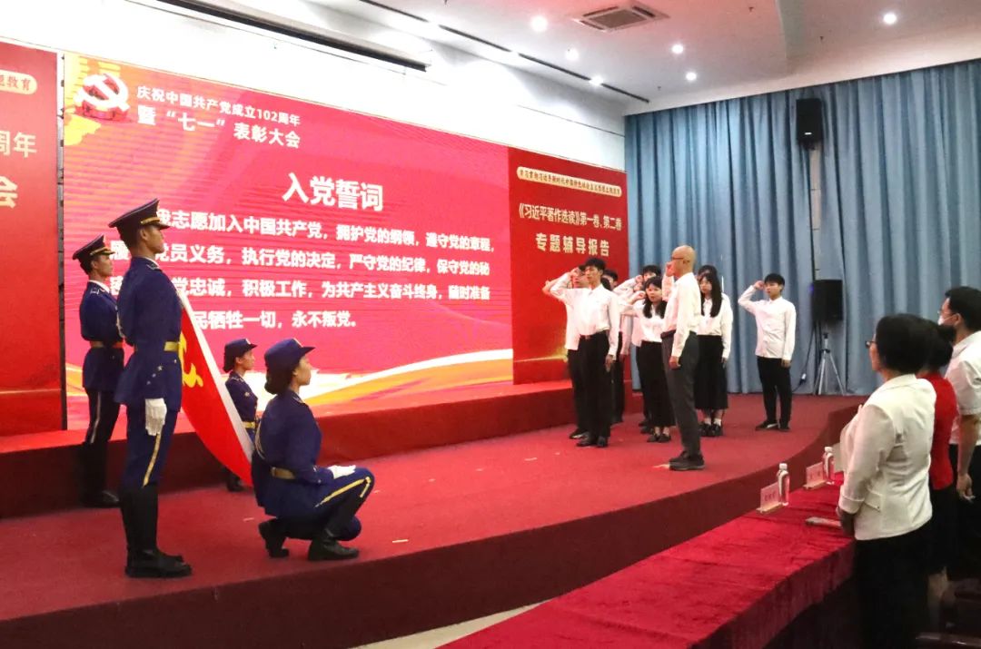 会上,隆重举行新党员入党宣誓仪式,新党员代表面向鲜红的党旗庄严宣誓,后勤产业党工委书记、党龄近50年的老党员赵过渡同志领誓,进行参会的全体党员重温入党誓词。