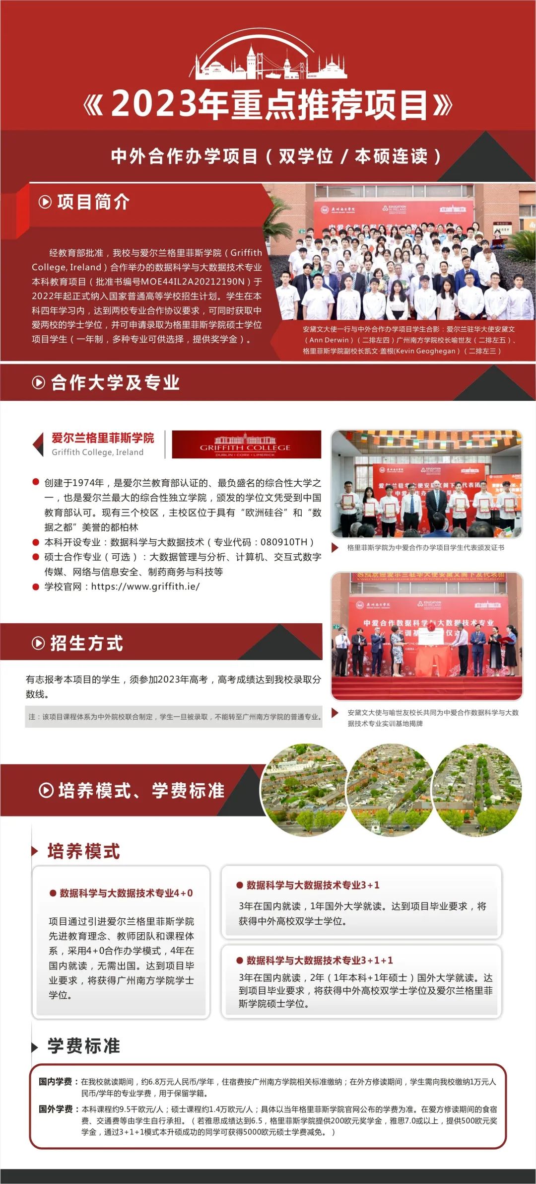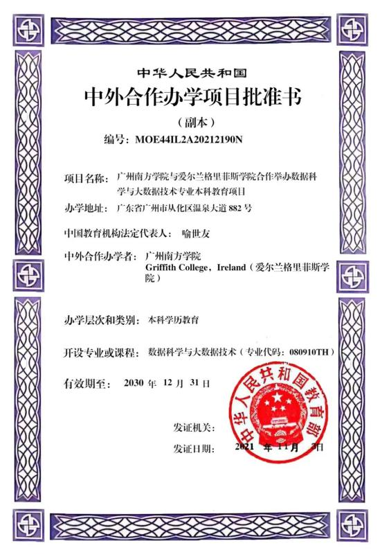 2021年11月,经教育部批准,Beat365中文官方网站与爱尔兰格里菲斯学院合作举办“数据科学与大数据技术”专业本科教育项目。这是Beat365官网第一个获得教育部批准的中外合作办学项目,填补了我省大数据专业中外合作办学领域的空白。