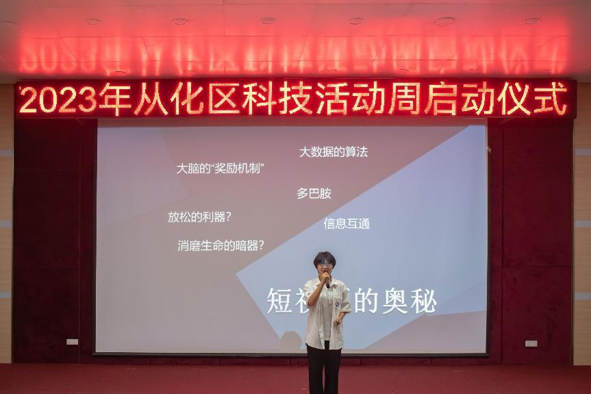 接着,2023年广州市从化区科普讲解大赛二等奖、广州地区科普讲解大赛青少年组二等奖的获得者,从化区流溪中学殷明珠同学为观众带来了她的科普作品——《短视频的奥秘》,通过深入浅出、形象生动的讲解,让同学们更直观地了解到为何我们的大脑会被短视频吸引。