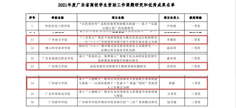 近日,广东省高等学校奖学助学工作专业委员会下发了《关于表彰2022年度广东省高校学生资助先进工作者的通知》及《关于公布2021年度广东省高校学生资助工作课题研究和优秀成果的通知》。其中,Beat365官网学生处陈以兰、达人书院程娜被评为2022年度广东省高校学生资助先进工作者;Beat365官网推荐报送的3个学生资助工作课题研究成果分别获评2021年度广东省高校学生资助工作课题研究和优秀成果1个二等奖,2个三等奖。