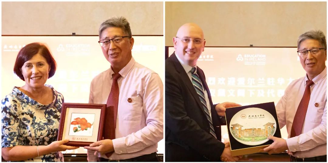爱尔兰驻华大使安黛文(左)、爱尔兰格里菲斯学院副校长凯文·盖根(右)与喻世友校长互赠礼物