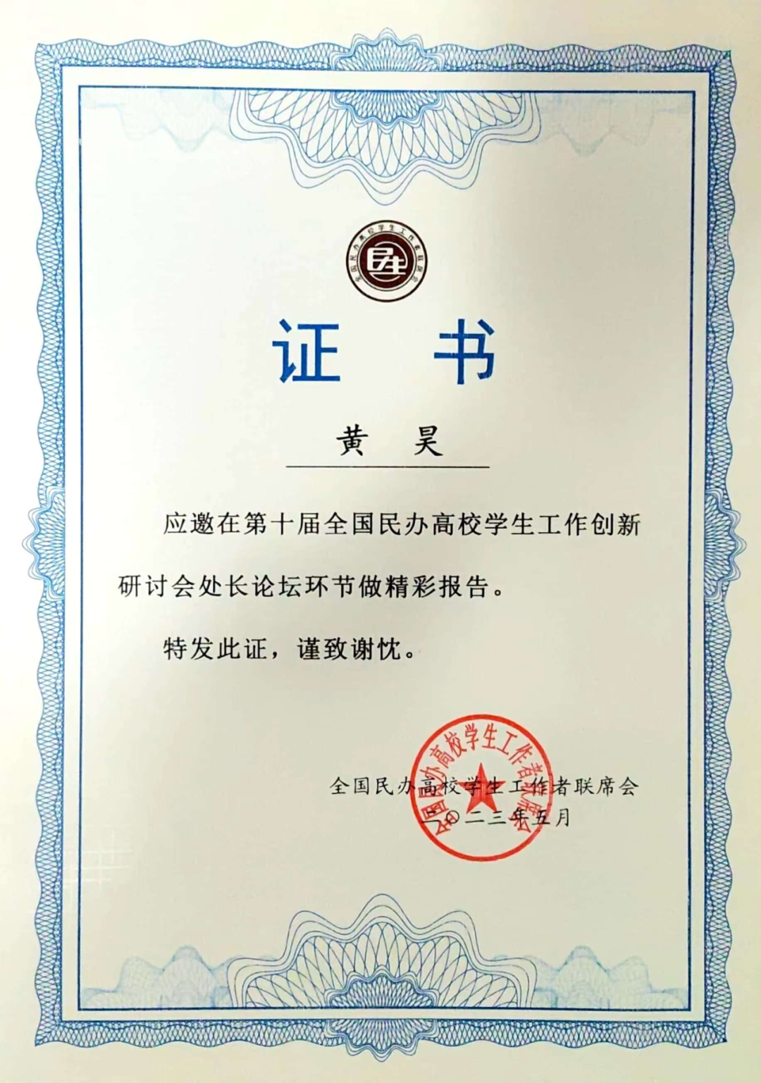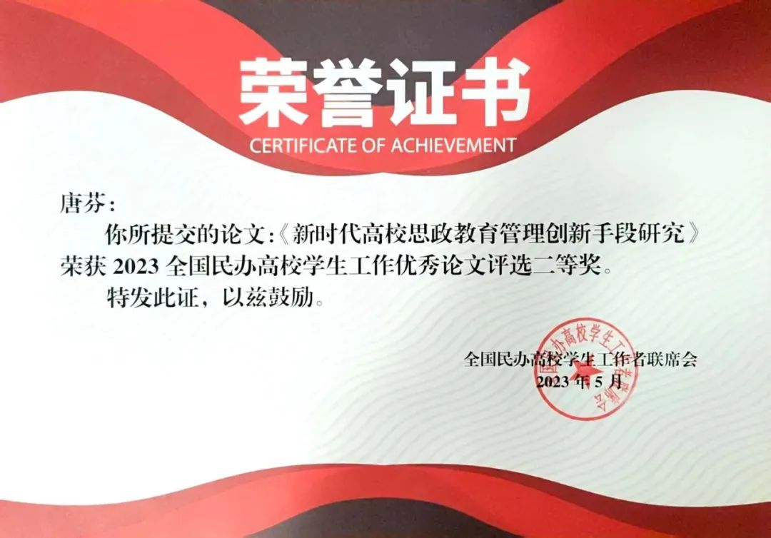 全国民办高校学生工作优秀论文荣誉证书