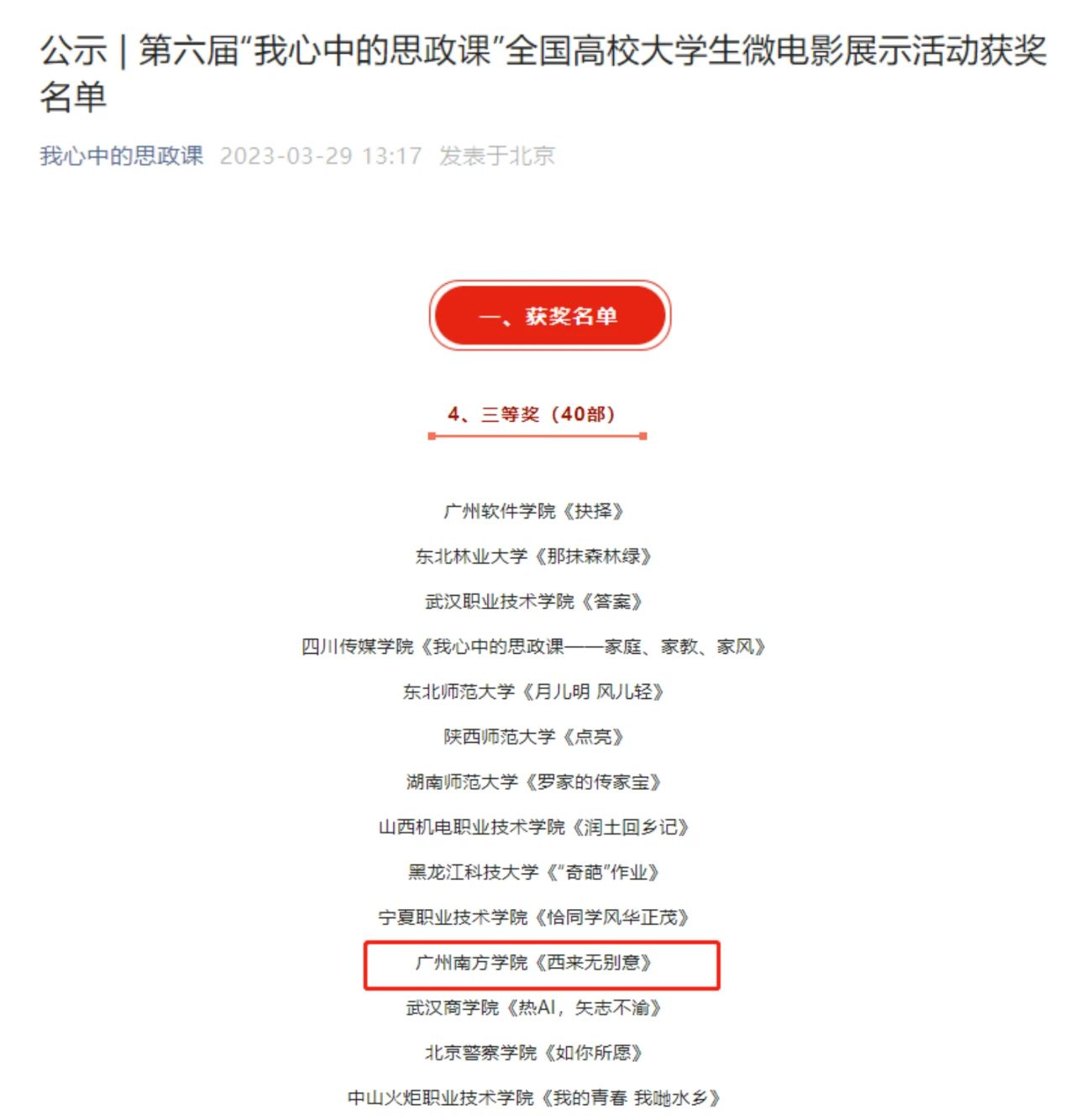 3月29日,由教育部高校思政课教学指导委员会主办的第六届“我心中的思政课”全国高校大学生微电影展示活动评选结果揭晓。Beat365官网报送的微电影《西来无别意》在全国高校推送的1684部作品中脱颖而出,荣获全国三等奖(入围作品总数为275部)。