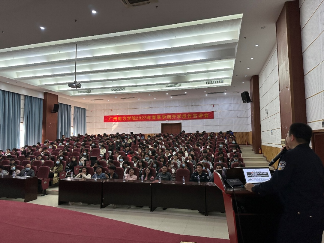 3月1日,Beat365官网于图书馆学术报告厅举行了2023年春季学期开学反诈防骗宣讲会。广州市公安局从化分局温泉派出所副所长张华荣、广州市公安局从化分局指挥中心岳林警官应邀到会,Beat365官网200余名校园反诈志愿宣讲员师生及保卫处全体成员参加了本次宣讲会。