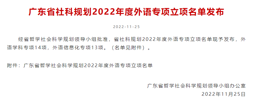 广东省社科规划外语专项“外语学科专项”由省社科规划办立项,旨在促进我省高等院校外语学科的建设与发展,加大对粤东西北高校外语教学与科研的支持力度,促进全省外语学科建设的均衡发展和科研能力的整体提升。