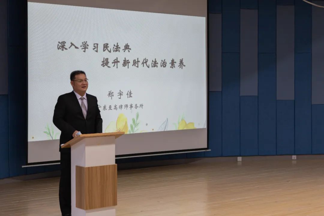 随后,郑宇佳律师用生动的语言和贴近实际的案例为现场师生们宣讲民法典相关内容。讲座中,郑律师从“解读《中华人民共和国民法典》的三个维度、全面认识民法典、全面读懂民法典、众览解读民法典合同编、关于侵权责任的法律问题、其他日常的民法典常识、民法典与当代使命、民法典与法治未来”等八个方面作了详细解读。