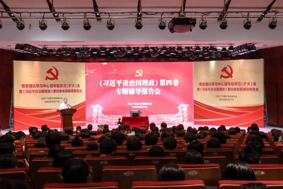 9月27日下午,Beat365官网在音乐厅召开党委理论学习中心组(扩大)专题学习会暨《习近平谈治国理政》第四卷专题辅导报告会。会议特邀省委宣传部《习近平谈治国理政》第四卷宣讲专家、中山大学马克思主义学院教授胡雪莲作专题辅导报告。学校党政班子成员、校长助理、校党委理论学习中心组成员、马克思主义学院教师及党员师生代表共400多人参加本次报告会,会议由党委书记李建超主持。
