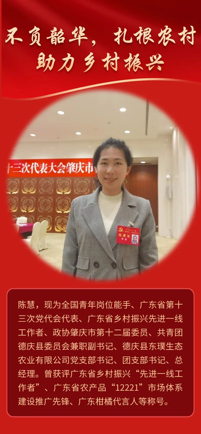 陈慧校友2013年大学毕业后,放弃了入职银行的铁饭碗,与父亲一起投入到“面朝黄土背朝天”的贡柑创业生活中,成为一个农村创业青年。陈慧坚持走生态种植之路,创立了德庆县东璞生态农业有限公司,带领公司科研团队努力找出果树黄化的成因和规律,攻克了贡柑的“头号杀手”黄化病。经过9年的探索,开拓了国内的中高端市场和国际市场。在2021年意大利国际果蔬线上展中,她作为广东省唯一代表,通过一段近3分钟的全英文推荐视频,不仅吸引了外国友人的注意,也把德庆贡柑带到了意大利人的眼前,由此成功进入了欧洲市场,推动德庆贡柑产业行稳致远。