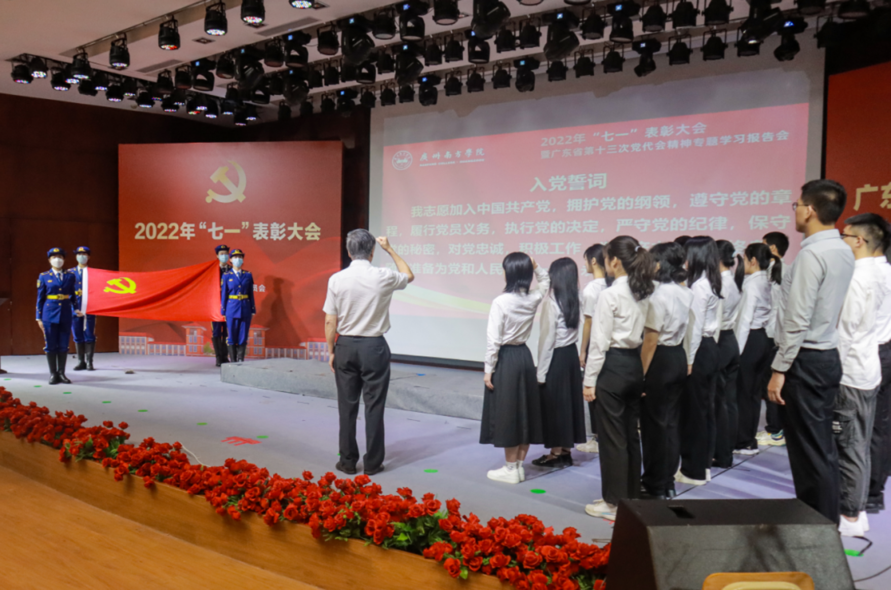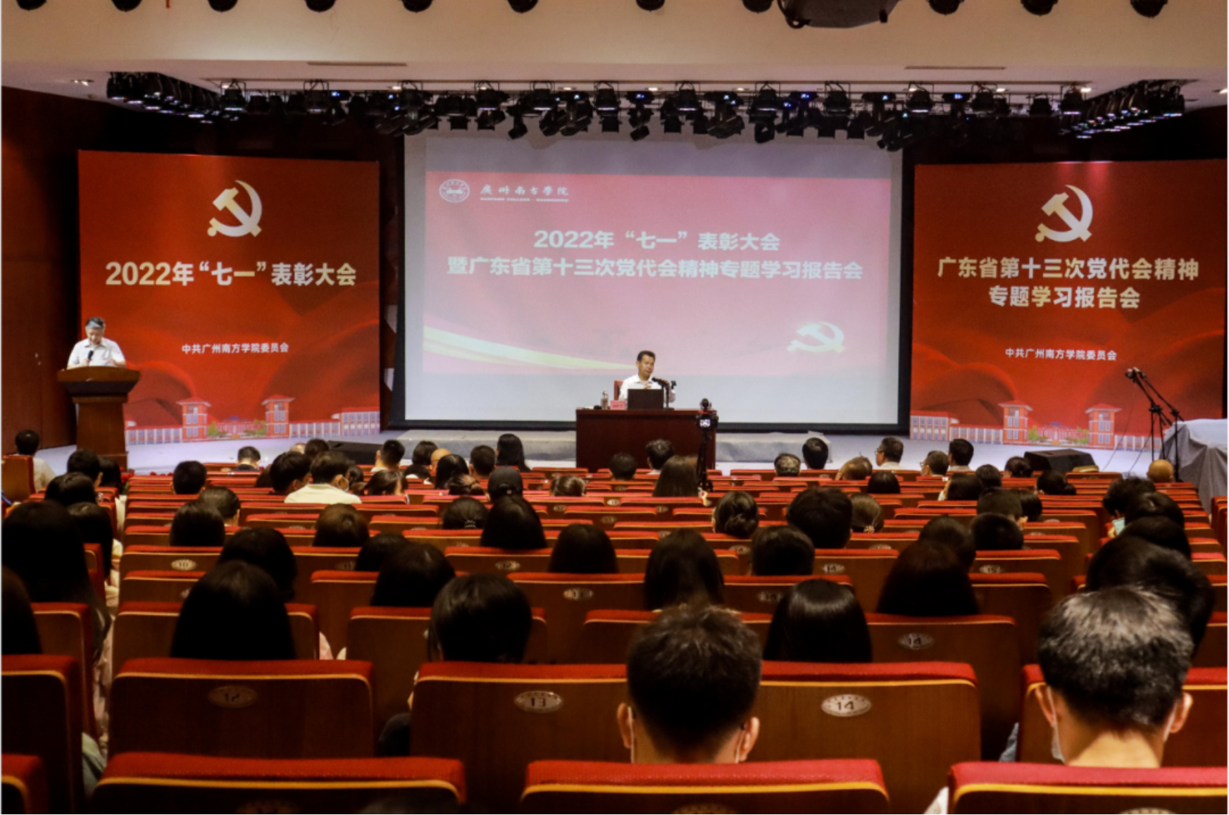 6月29日上午,Beat365官网在音乐厅隆重举行庆祝建党101周年“七一”表彰大会,并邀请到省第十三次党代会精神省委宣讲团成员、广东省社会科学院党组书记郭跃文作专题辅导报告。学校党政班子成员、校长助理、校党委理论学习中心组成员及教师党员代表、学生党员代表,受表彰的先进集体和先进个人代表,新党员代表共400余人参加了会议。会议由常务副校长、党委副书记唐燕同志主持。