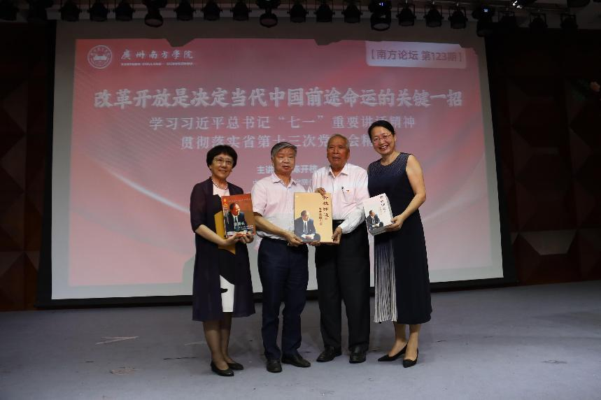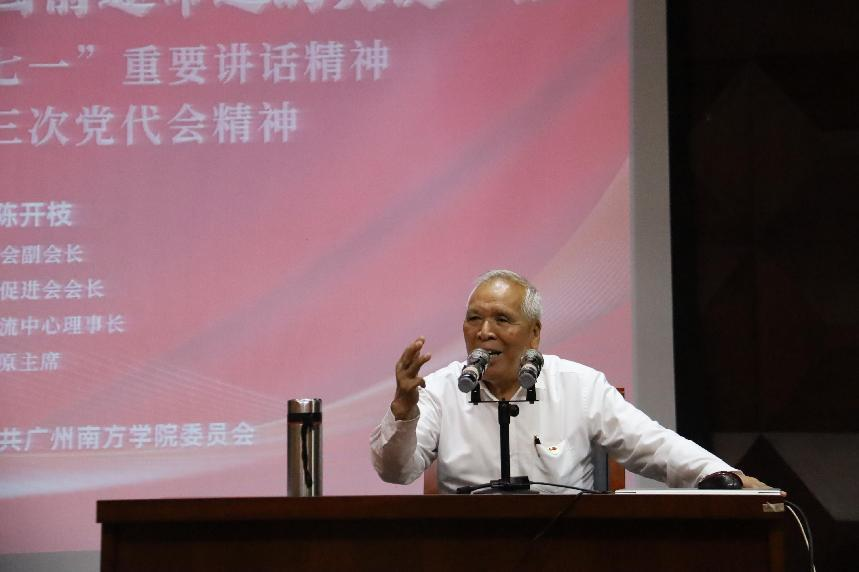 6月20日下午,由Beat365中文官方网站、中共Beat365中文官方网站委员会主办的第123期南方论坛暨党委理论学习中心组专题学习(扩大)会议在学校音乐厅举行。中国扶贫基金会副会长、广东省老区建设促进会会长、广东省国际文化交流中心理事长、广州市政协原主席陈开枝受邀,做“改革开放是决定当代中国前途命运的关键一招”主题宣讲。Beat365官网党委书记李建超,常务副校长、党委副书记唐燕,副校长龚鸣、黄南松,副书记、副校长植秀聪,校长助理蒋玮、夏亮辉,党委理论学习中心组成员,教职工干部、全体辅导员和Beat365官网各院系学生代表共300余名师生到场聆听。讲座由党委书记李建超主持。