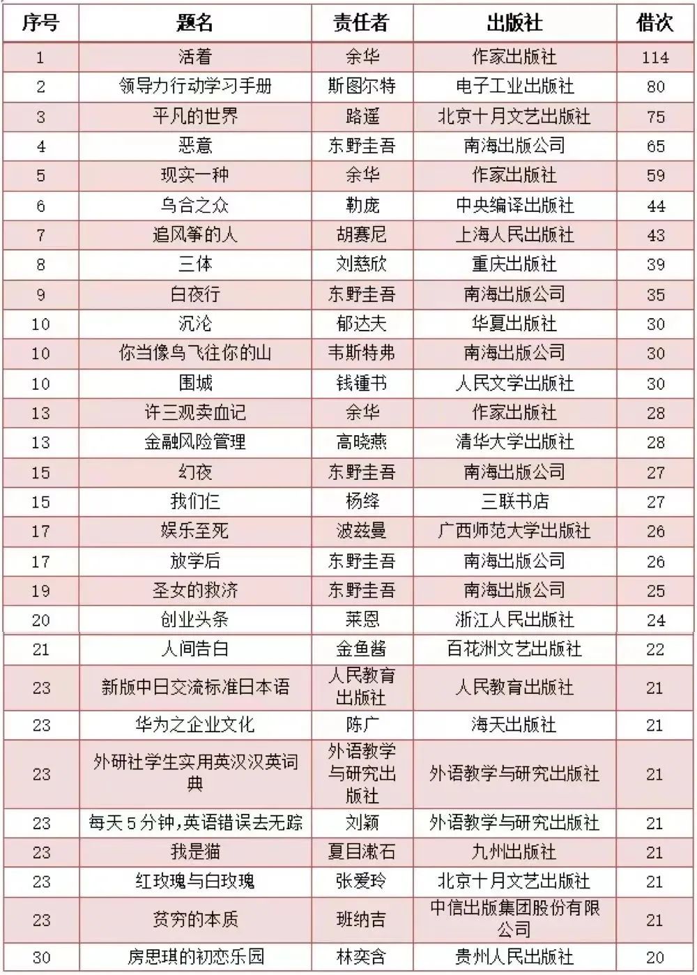 (学生读者借阅册次排行前十五)