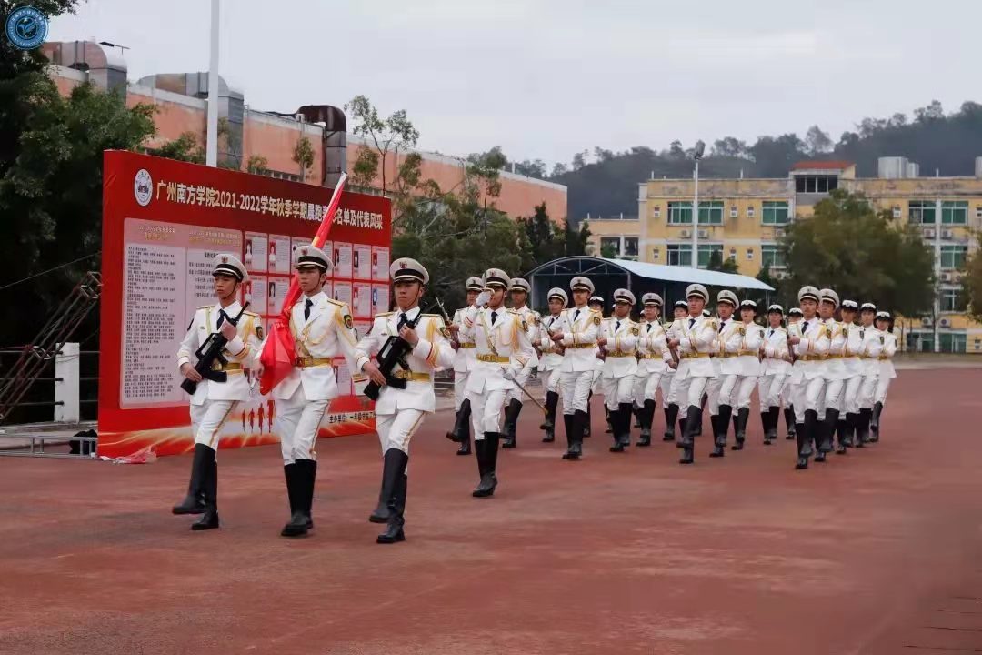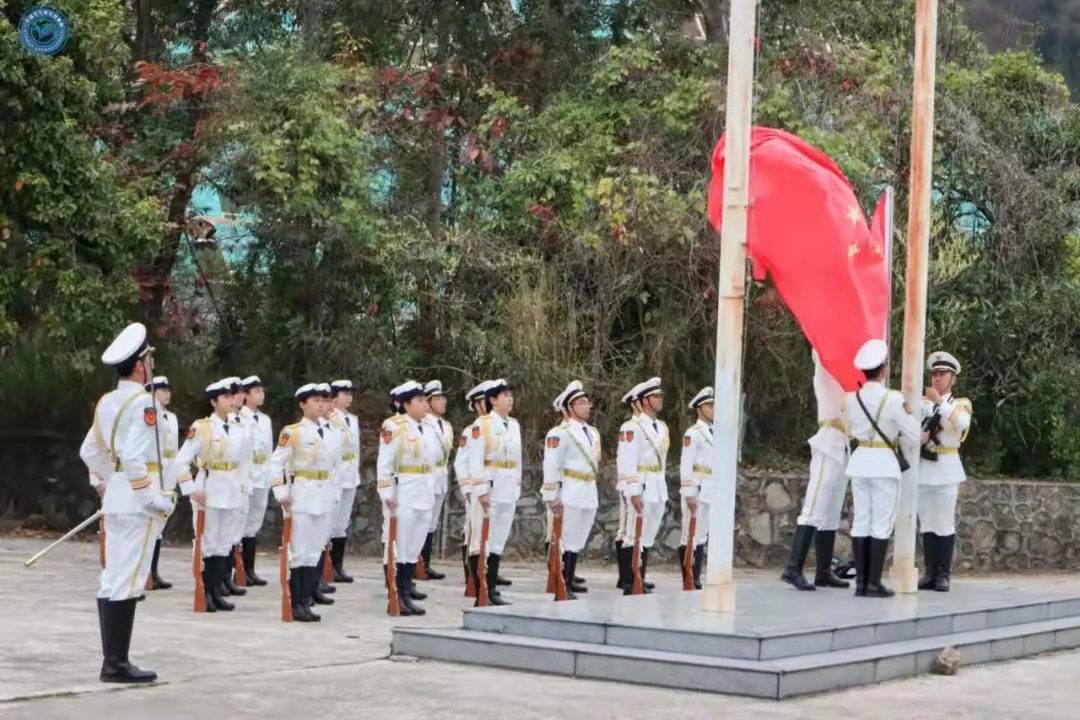 学校大学生国防教育队踏着整齐的步伐护送五星红旗入场,鲜艳的五星红旗伴随着国歌声冉冉升起,全体师生向国旗行注目礼,向祖国表达深切的祝福。