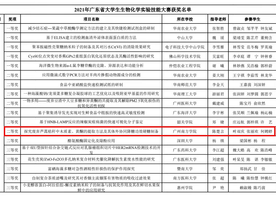 凭借《探究废弃芦篙秸秆中木质素、黄酮的提取方法极其体外协同降糖功效硬糖制备》项目,再次荣获广东省大学生生物化学实验技能大赛二等奖!