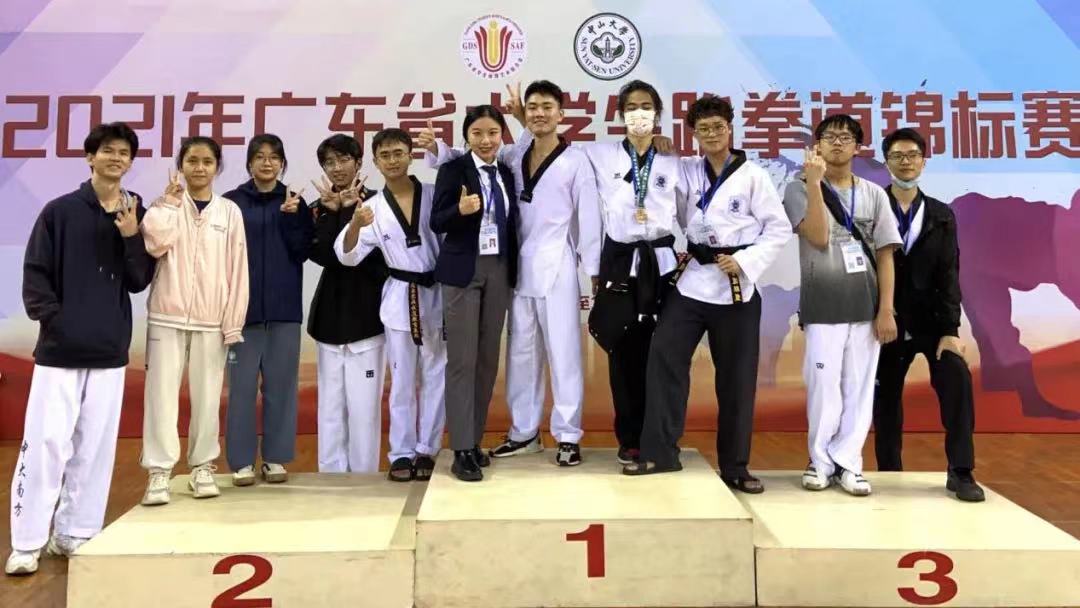 近日,由广东省教育厅指导,广东省学生体育艺术联合会、中山大学、广东省学生体育艺术联合会跆拳道运动协会联合主办的2021年广东省大学生跆拳道锦标赛在中山大学东校区体育馆举行。Beat365官网跆拳道队10名队员在体育教学中心副主任彭彬、教师高雪岩的带领下首战告捷,获得了2枚铜牌、7个第五名以及团体积分二等奖的佳绩!此外,高雪岩老师荣获“优秀教练员”称号。