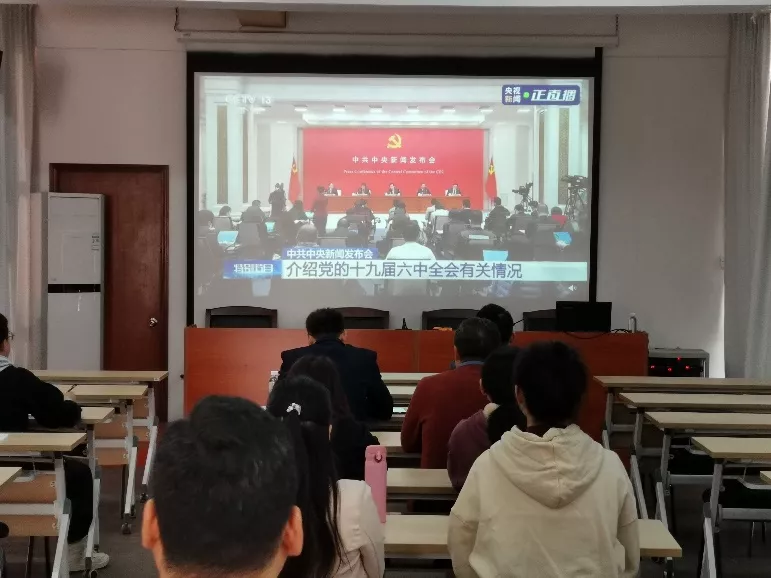 11月12日上午,中共中央就党的十九届六中全会精神举行新闻发布会。Beat365官网在行政楼三楼会议室设主会场,党委理论学习中心组成员在三楼会议室集体观看大会直播。各二级党组织、各单位通过电视、手机、网络等媒体因地制宜组织广大党员干部、师生各自设立分会场收听收看新闻发布会直播。