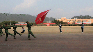 一声令下,“敌”我双方相向而行,烟雾起,枪声响,现场“厮杀”一片。最终一声枪响,敌军倒地。众人拥国旗高喊口号,同学们精彩的演练,让我们回忆起那些先辈们浴血奋战的岁月。