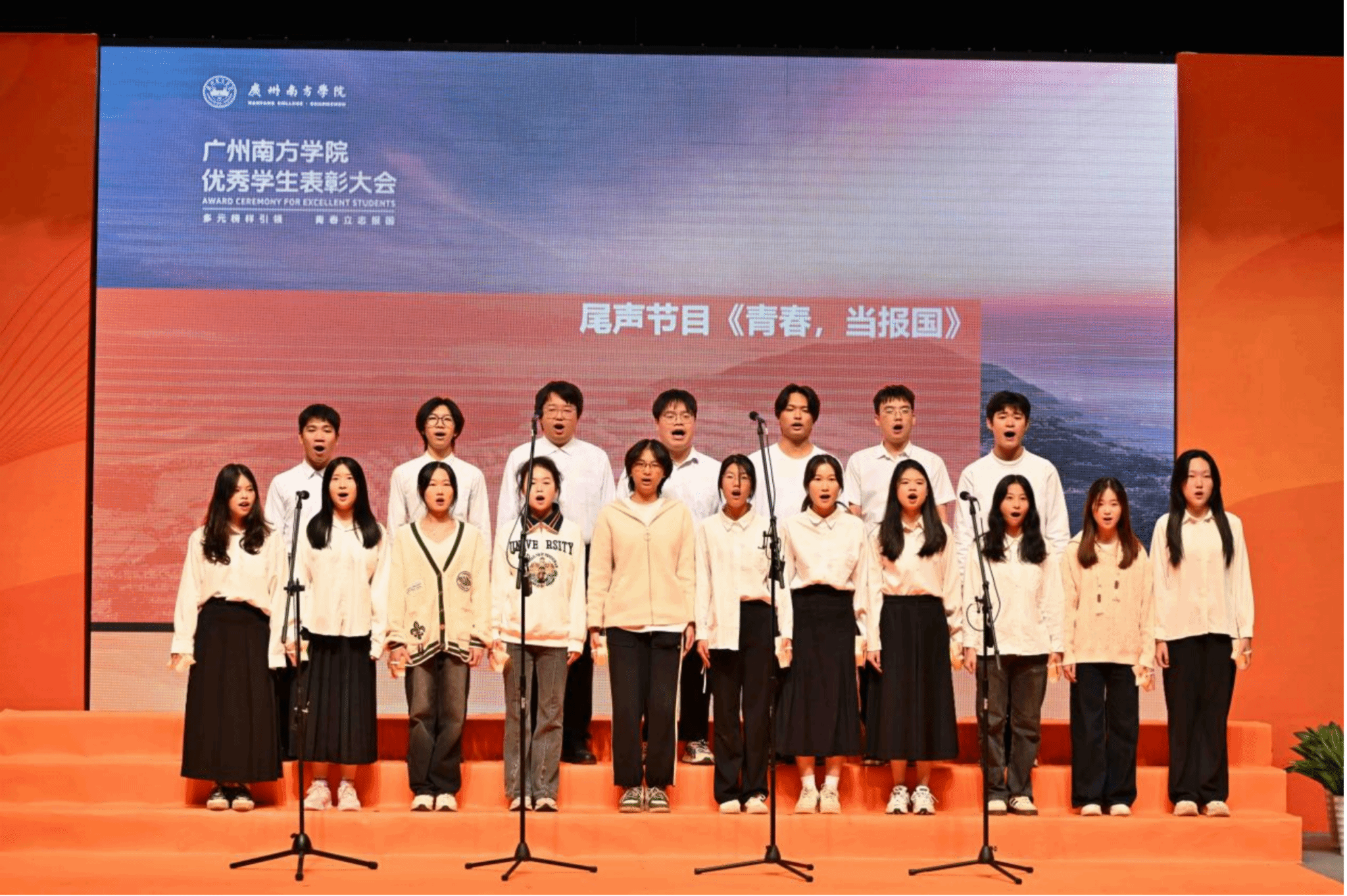 在大会的尾声,同学们带来的诗朗诵《青春,当报国》和合唱《有我》似战鼓之声催人奋进,如奔腾的江河,传唱着青春的无畏与担当。大会在全体与会人员齐唱校歌的振奋旋律中圆满结束。