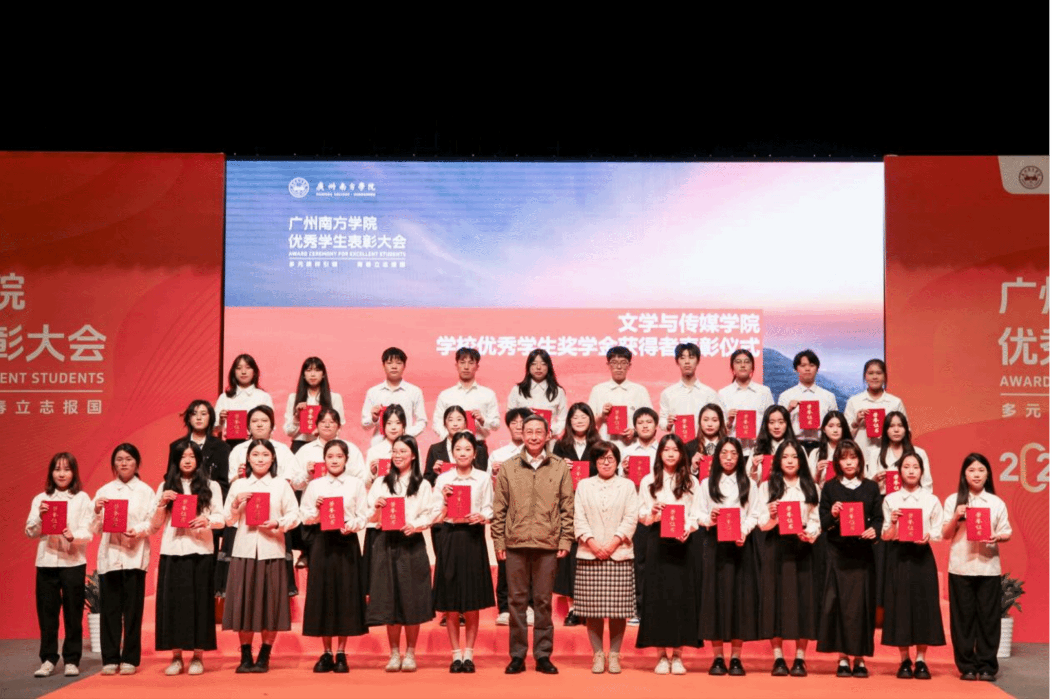 文学与传媒学院孙立院长、周凤玲教授为该院优秀学生奖学金获奖代表颁奖